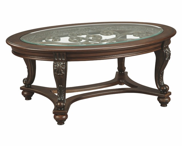 Signature design by ashley norcastle oval cocktail table com coffee tables glass top furniture wood homemakers height dark brown home in 2021 ashley furniture signature design norcastle glass top coffee table barkeaterlake com. This oval cocktail table is graced with a wood framed top with cast filigree pattern under clear beveled float glass. The norcastle oval coffee table deserves a toast for incorporating so many elements so seamlessly. Norcastle round end table by ashley. This oval coffee table deserves a toast for incorporating so many elements so seamlessly.
